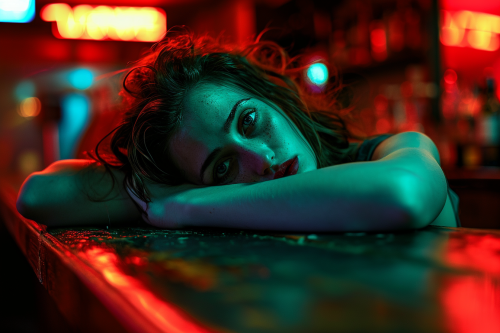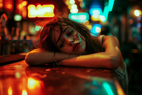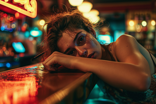 Photograph inside a late-night bar. A woman with her arms and head on the bar. Her mascara is running, her lipstick is smeared, and her hair is mussed. Her eyes are open but she is exhausted. --ar 3:2 --v 6.0