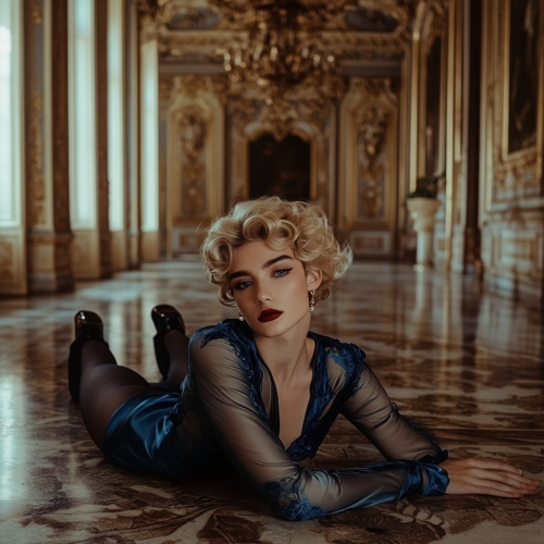 In the photo, a beautiful 16-year-old man with short, beautifully styled blond curls, earrings in his ears, lipstick on his lips, in a blue blouse, in dark, transparent tights and in dark high heels, lies on the floor against the background of a hall in a palace