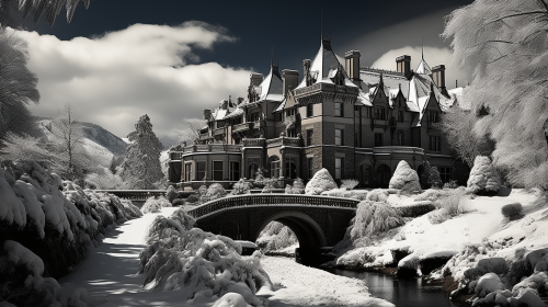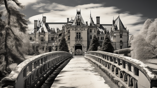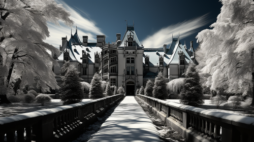 Biltmore Estate. Asheville, North Carolina in the snow. Beautiful snowy landscape. Christmas time. Extremely blue clear skies. Very very blue skies. Mirage effect.m Extreme low angle shot. Worm’s eye view. Black and white photograph with vibrant autumn color splash. High - end. Stylish. Important. Mysterious. Black and white. Shot with a Pentax. K - 3 III Monochrome. --ar 16:9 --q 0.5 --s 750
