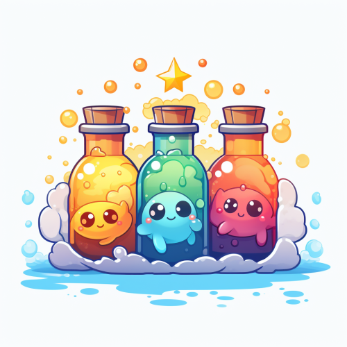 [3a6a2ceea] A Chibi style game launch icon with two transparent bottles, each containing three different colored liquids. A bottle is pouring liquid into another bottle in mid air, and then there are small water droplets splashing out --v 5.2 --ar 1:1 --c 0