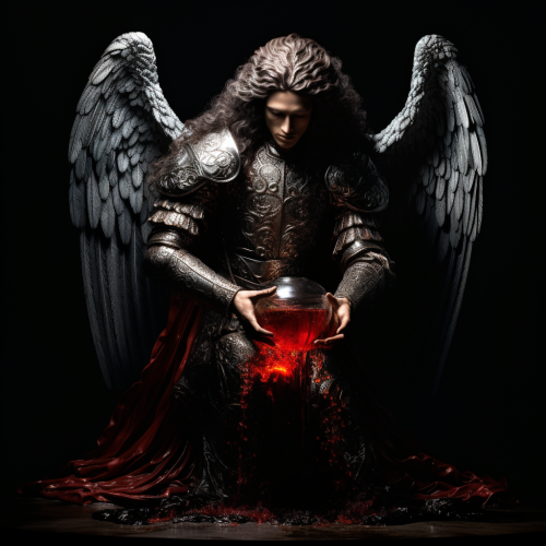 an masculine ange, standing upright one grail in each hand, liquid being poured from one grail to another grail, while standing up and looking towards camrea, hints of red, black background
