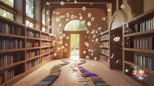 Interior scene with a dynamically balanced compostion of a higher education-inspired literacy center in New Mexico, with an emphasis on how literacy opens doors to new opportunities. The design is modern yet warm, featuring earthy tones, wooden shelves lined with books, and large windows that fill the space with natural light. Floating letters, numbers, and subtle educational symbols gently move around the room centralized over a path that leads to the open door of opportunity, the door opens into a bright environment evoking a sense of intellectual growth without being overly fantastical. Doorways, arches, or pathways leading from bookshelves symbolize the idea that reading unlocks new journeys. The five pillars of literacy--phonemic awareness, phonics, fluency, vocabulary, and comprehension--are reflected through thoughtful design choices, such as study areas and quiet reading nooks. The atmosphere is inspiring and inviting, filled with the energy of discovery while maintaining a grounded, academic feel. in the vintage style of the reading rainbow--no text, no logos, --aspect 16:9