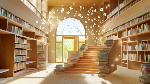 Interior scene with a dynamically balanced compostion of a higher education-inspired literacy center in New Mexico, with an emphasis on how literacy opens doors to new opportunities. The design is modern yet warm, featuring earthy tones, wooden shelves lined with books, and large windows that fill the space with natural light. Floating letters, numbers, and subtle educational symbols gently move around the room centralized over a stairway made of books that leads to the open door of opportunity, the door opens into a bright environment evoking a sense of intellectual growth without being overly fantastical. Doorways, arches, or pathways leading from bookshelves symbolize the idea that reading unlocks new journeys. The five pillars of literacy--phonemic awareness, phonics, fluency, vocabulary, and comprehension--are reflected through thoughtful design choices, such as study areas and quiet reading nooks. The atmosphere is inspiring and inviting, filled with the energy of discovery while maintaining a grounded, academic feel. in the style of the reading rainbow --no text, no logos, --aspect 16:9