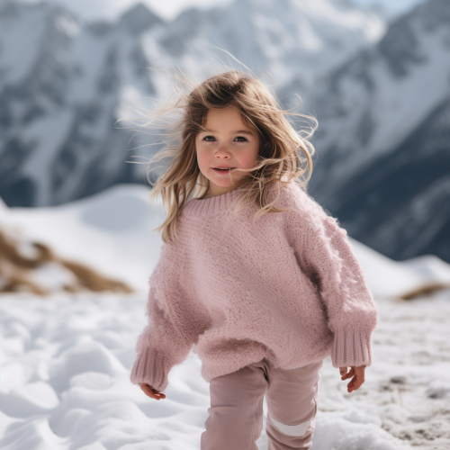 4 years old cute little girl is walking in a glacier. Full body picture backwards. Snowy mountains in the background. Girl is having really messy hair and cute sweater. Her hair is full of snow. It is snowing. Warm inviting natural lighting, cinematic lighting, photorealistic, atmospheric, hyper quality, ultra realistic photo style, full details. Full moon and pink sky.