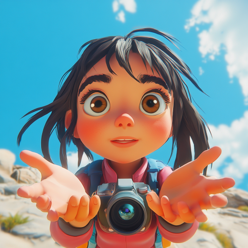 A curious LITTLE GIRL Carton character from planet Zionatron, Turquoise and light pink themed, big colorful eyes, intricate details, 3D, Children's book illustration style, tricolor gradient bright background --v 5.2 --ar 9:16