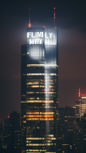 A modern skyscraper seen from afar with the word "Humility" written on it as white lights, “HUMILITY” humility “H U M I L I T Y” HuMILITy written in Arial, HUMILITY light, vertical text H U M I L I T Y, neon light, at night --v 5.2 --ar 9:16