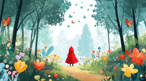 cute,Little Red Riding Hood,different angles,character sheet,ghibli style,childrens book,illustration,--niji5--ar16:9