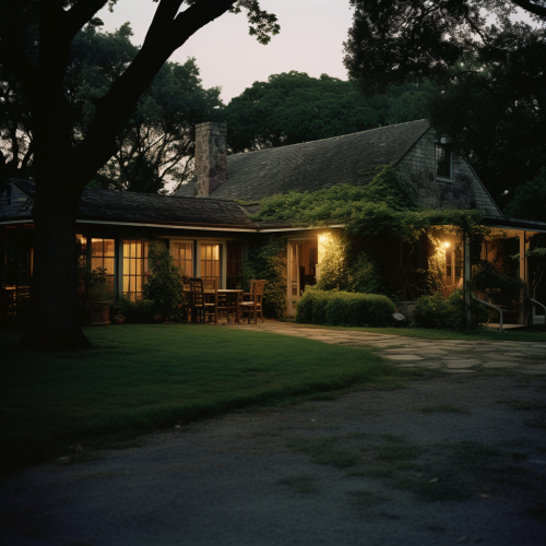 1920s, dimly lit remote single story speakeasy at night on a wide lawn, the external facade is all stone with thick wooden windowsills and big windows, a long walkway with Doric columns and shrubs on either side, leading up to a heavy wooden front door, with a short awning, unassuming, montauk highway, old timey