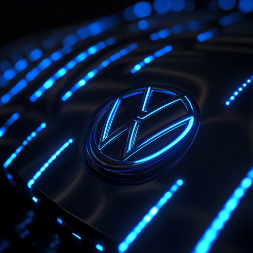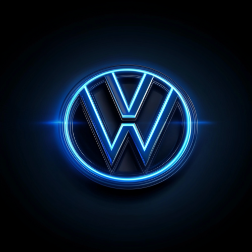 A dark background. Abstract graphic style. Close up of the Volkswagen logo. Flat vector style. The logo is backlit and illuminated by blue pulsating energy like in the movie Tron