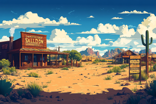 Illustration of a two-dimensional Wild West with smooth and clean lines and contours. emphasizing simplicity and minimal detail. Sunny morning. house with sign, next to Saloon. Bright contour illustration, wild west atmosphere, drawn, rich colors, comic drawing style --s 250 --v 6.1 --ar 3:2