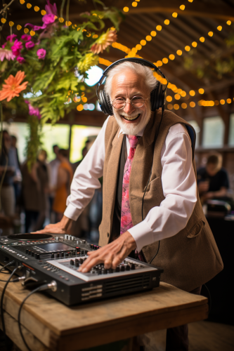 Long Shot, happy DJ playing at a Barn house wedding, guests are dancing with each other and wearing bright colors: HEX #FF5A65, HEX #CC4850, HEX #E6E8EB, HEX #802D32, hex #FF8087, --ar 2:3