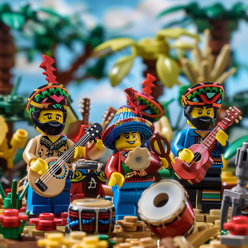 A lego band playing latin music all dressed in traditional carribbean clothing and playing traditional latin instruments