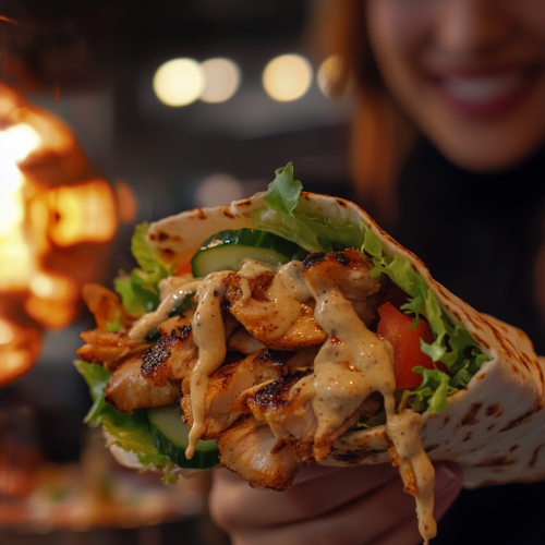 A cinematic and highly detailed shawarma restaurant advertisement featuring a close-up of a freshly sliced chicken shawarma wrap being prepared. The wrap is filled with tender, juicy slices of marinated chicken, grilled to golden perfection, with slightly charred edges that enhance its flavor. A generous drizzle of garlic sauce and tahini runs down the side, while fresh ingredients like crisp lettuce, thinly sliced cucumbers, ripe tomatoes, and tangy pickles create a vibrant mix of colors and textures. The wrap itself is lightly toasted, giving it a slight crunch. The setting is a lively, street-food-style restaurant with the iconic rotating shawarma spit in the background, loaded with golden-brown chicken. The camera captures the scene from a close, low angle, focusing on the chicken shawarma wrap, while the background remains softly blurred. A smiling female model, mid-20s with long, dark hair tied in a casual ponytail, holds the wrap in her hand, excitedly lifting it to take a bite. Her expression shows pure joy and anticipation. The warm, natural lighting from the side highlights the textures of the chicken and the shine of the sauces. The atmosphere feels cozy, inviting, and full of life. Shot with a 35mm lens, this angle provides a perfect balance between the shawarma and the energetic ambiance of the restaurant