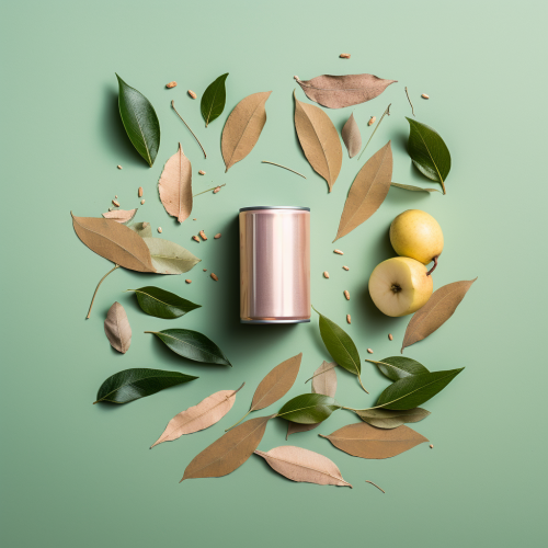 Aerial view, a can laying flat on a surface. above the can there is apple halves, sage leaves, ginger root, stark honesty, photographic source, delicate washes, toning technique, solid color pastel background, minimalism