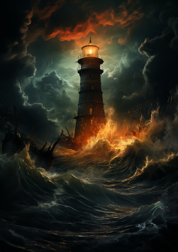 Before dawn, serenity. Horror Lighthouse image horrific Wormhole, isthmus, Electronic drum kit, horror style, and a Cinematic view --v 5.2 --c 15 --style raw --s 300 --ar 5:7