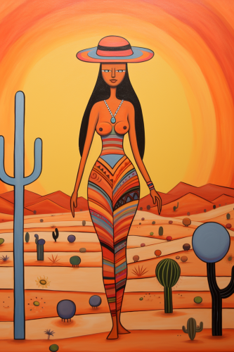 una persona haciendo del cuerpo, in the desert, cartoon, laurel burch style --ar 2:3