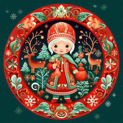 Circular design Ded Moroz, Holiday wreath with a baby deer with colorful bows, a green Christmas tree on a red background with white snowflakes russian style, snow, cartoon , laurel burch style --ar 1:1
