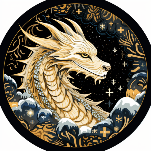 Circular design Ded Moroz, a Black Dragon on a gold background with white snowflakes russian style, snow, cartoon , laurel burch style --ar 1:1
