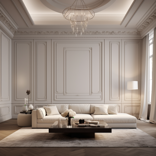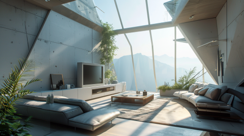 Spacious living room interior, showcasing a sophisticated blend of contemporary and Japandi styles. High ceilings and expansive windows allow natural light to illuminate the space. A warm color palette with wood and beige accents, a sleek, low-profile sofa, and a large piece of art as the focal point on a clean, white wall. Beautiful people are sitting smiling--v 6.1 --v 6.1