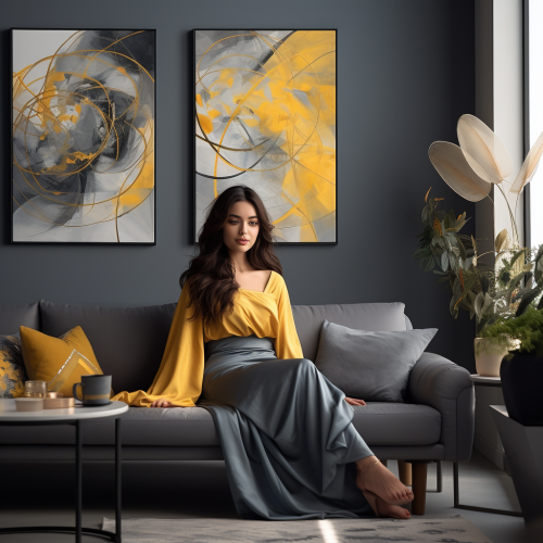 design of a living room with gray and gold theme, with decorations, and person sitting on a sofa, 4k, hyper realistic photo --s 250