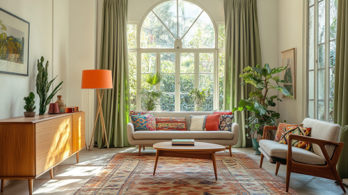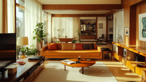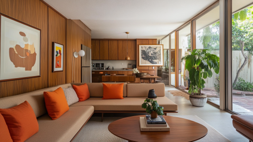 A mid-century modern living room with wood cabinets and a coffee table, a tan sofa with orange pillows, wall art on the walls, and warm lighting. --ar 16:9 --v 6.1