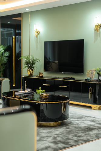 A modern living room with black and gold sideboards, TV stand, and coffee table in the same color scheme. The walls have light green tones. There is a carpet on the floor. In front of the TV, there are some plants. The furniture is arranged in a cohesive manner. Hyper-realistic. Shot taken from a wide angle. --ar 2:3 --style raw
