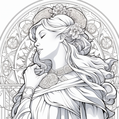 alphonse mucha inspired, omen valorant, bold black and white line art no shading, simple, white background, coloring page, ar 9:13