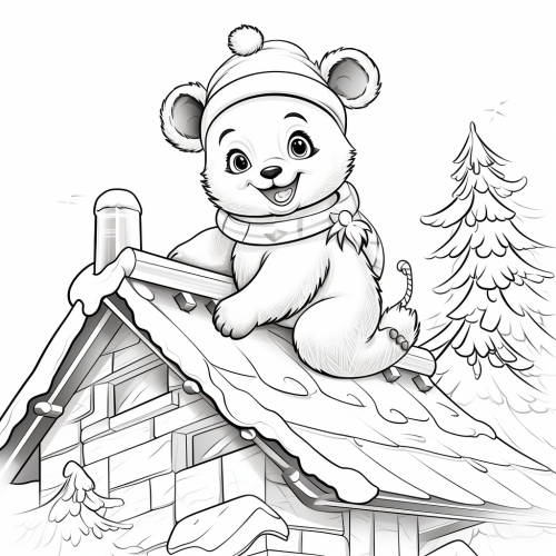 coloring book for children, a happy panda wearing christmas hat climbing on the house roof, detailed background, art for children, black and white, simple line, clean, no shadow