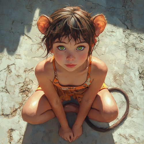 a little brown haired girl, very short hair, with monkey ears, monkey tail, she has vibrant green eyes, she has fair skin, it’s a sunny day, she is seated on the ground with nothing around her, the perspective should be from above her looking down on her, hyper realistic