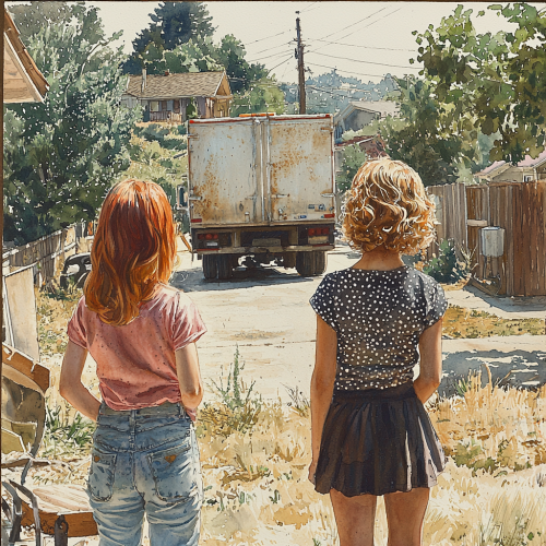 back view of two young girls standing outside in a yard. in the distance on a street there is a large moving truck parked on the side of the road, they are in a nice neighborhood, small, single family home surround them, its a sunny day, bright highly saturated colors. on the left is a young girl, age 12, red hair, fair skin, wearing a pink shirt, jeans, and white sneakers. on the right is a young girl, age 10, short blonde curly hair, wearing a polka dot shirt, black skirt, and sandals. water color color pencil style illustration --q 2 --s 750 --v 6.1