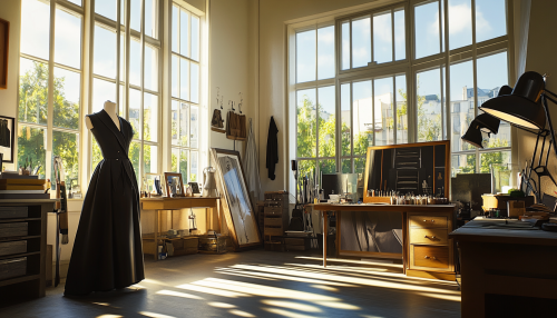 detailed image of the work of a dressmaker, workshop with large windows , sunny day, back light, 65 mm, photorealistic, fashion photo shoot for Vogue magasine, uhd image, 8k, --ar 7:4 --style raw --stylize 50 --v 6.1