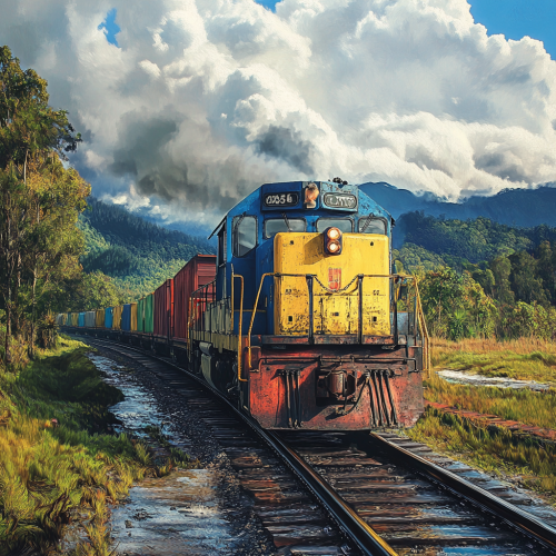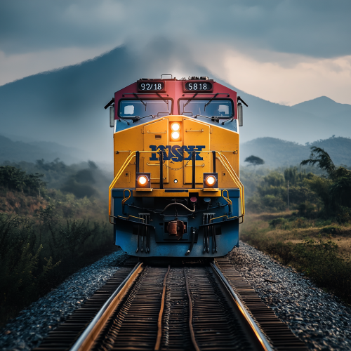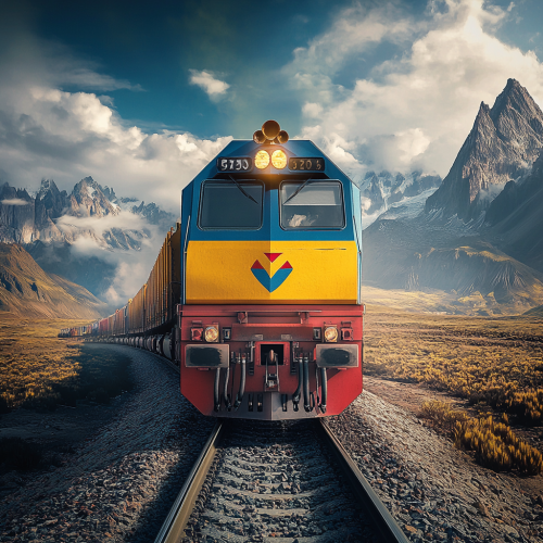 Hyper realistic. Realistic photo of a modern giant locomotive with load, traveling through an imposing Latin American landscape, seen from the front, with the colors yellow, blue and red