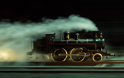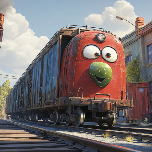 a freight railcar where the front leading locomotive railcar is a pickle. Pressing ahead with energy, power, boldness, and confidence. The colors are bright red, slate blue, and steel grey. In an animation Pixar style. Moving left to right and toward the viewer.