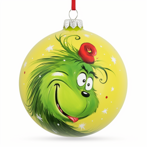A Christmas ornament with a bright, playful design featuring a green Grinch illustration. The ornament is round and glossy, with the Grinch's mischievous face prominently displayed, showing his iconic yellow-green eyes and sly smile. The background of the ornament is a soft, festive color, like pastel red or white, decorated with small holiday elements such as snowflakes, stars, or tiny red and green baubles. The Grinch is in a vibrant green color, with fluffy white trim around his Santa hat, adding to the holiday spirit. The ornament hangs by a red ribbon and has a glossy finish, reflecting holiday lights around it for a cheerful, whimsical Christmas vibe. --v 5.0 --ar 1:1