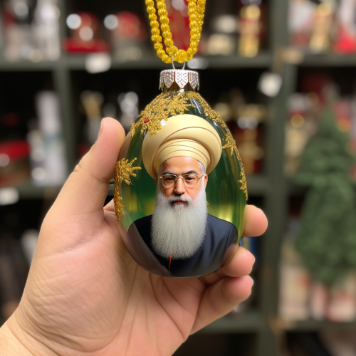 color photograph of supreme leader of Iran as blown glass Christmas Tree ornament