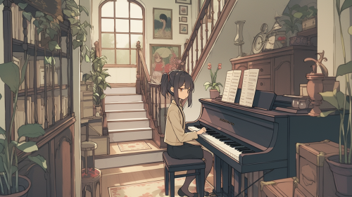 LoFi anime girl playing old wooden piano, old cosy room, --niji 5 --style cute --ar 16:9