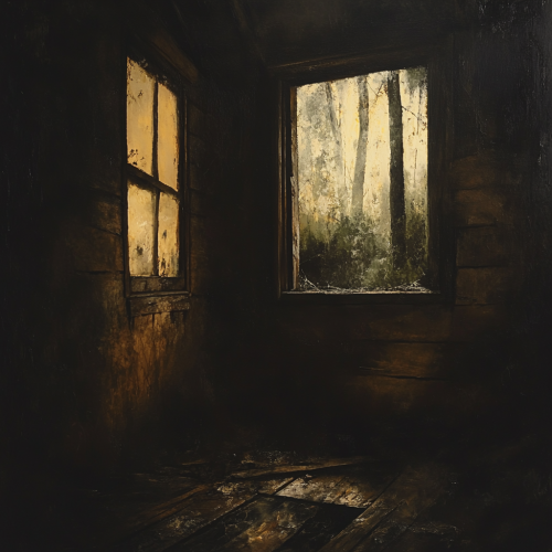 The interior of an old, abandoned cabin in a dense forest is shrouded in shadows. The scene is dimly illuminated by a faint, yellowish light coming through cracked, grimy windows. The wooden walls are a dark, weathered brown with patches of mold and cobwebs in the corners, creating a grim and oppressive atmosphere.