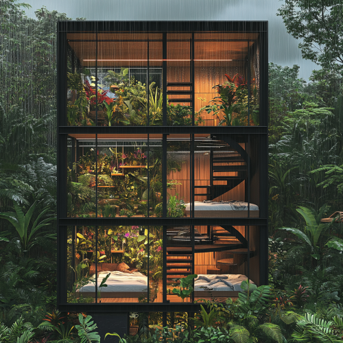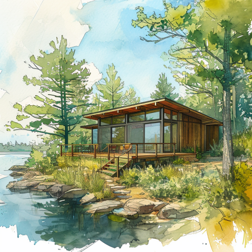 a watercolor architectural rendering showing the primary elevation of a forest cabin modern cabin with full vegetable gardens and a nearby lake --v 6.0