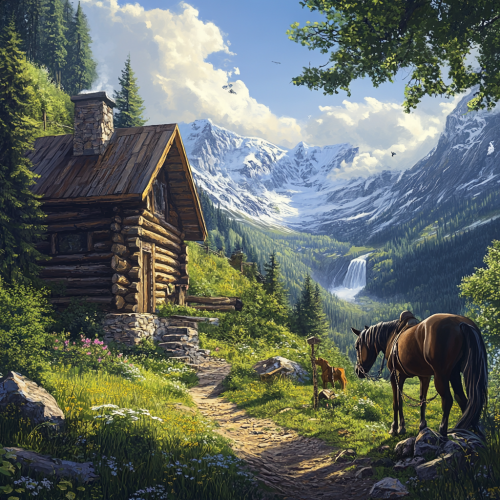 Realistic image of a log cabin on a mountain trail with a horse tied to a post outside. Lush green meadows and a distant waterfall are visible in the background.