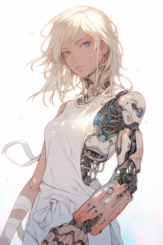girl, blue eyes, blonde hair, robotic arms, beautiful --niji 5 --ar 2:3
