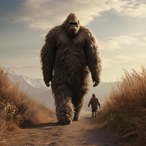Big Foot standing, looking down on a kid, facing the camera straight on. The creature should be large and imposing. Focus on detailed textures of its brown fur and the surrounding forest environment, ensuring clarity and realism, hyper-realistic