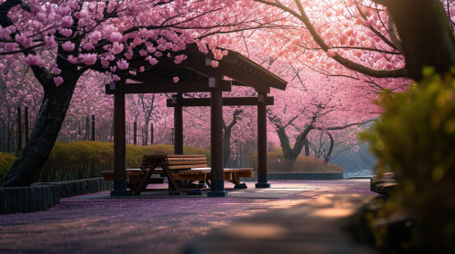 An elegant Japanese Zen temple surrounded by a carefully maintained garden, showcasing a grand weeping cherry blossom tree in vivid pink bloom. The tree stands beside the traditional temple building with its wooden structure and large, open veranda, framed by mountains in the background. The raked gravel garden features precise, flowing patterns that reflect a sense of inner peace. Soft morning light filters through the blossoms, casting gentle shadows and enhancing the spiritual ambiance of the scene. Photorealistic, highly detailed, 8K resolution --ar 9:16 --v 6.1 --style raw