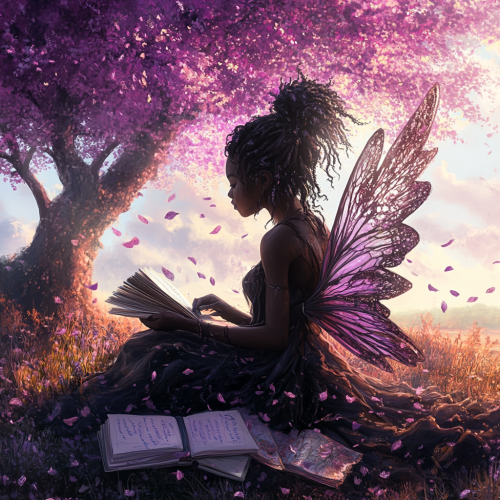 logo for artist channel where it’s the photo of a semi realistic black fairy doing art, with books and open notebooks with writing in them and yarn and crafts around her sitting in a field by a tree with purple leaves