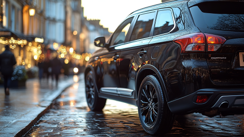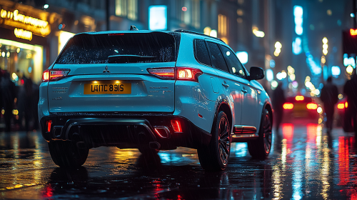 Photo of a mitsubishi outlander white bodywork. in london, at night, shot on a Sony mirrorless camera, DSLR, 50mm lens f/2.8, ultra detailed, 8k, --ar 16:9 --v 6.1 --s 750 --style raw