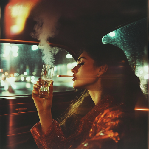 a polaroidphoto of a girl wearing design clothes at the back of a cab in london night smoking a cigarette and drinking champagne, blurry photo, movement