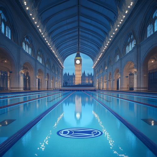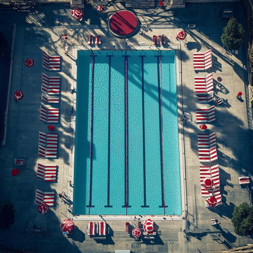 Concept image of an iconic olympic swimming pool with diving blocks, red and white lane ropes and red and white striped sun loungers with parasols. located beneath the Eiffel Tower. aerial shot. Fujifilm, --style raw --ar 1:1