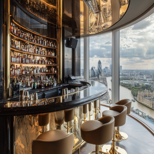 interior cool bar, hyper luxury bar, contemporary, bold colour, metal brass detailing, beautiful bottle display, leather bar stool, swanky furniture, mirror ceiling, contemporary furniture, view of London from high floor