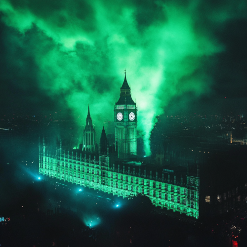 a huge neon green spotlight is illuminating the London house of parliament from above, night time with ominous dark clouds, a lot of people watching the spotlight, cinematic shot ar 16:9