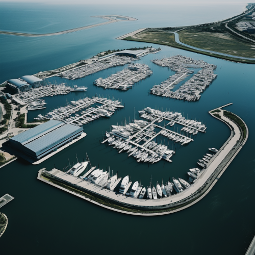 aerial view over a large complex marina in black water with no shore hyperrealistic photograph