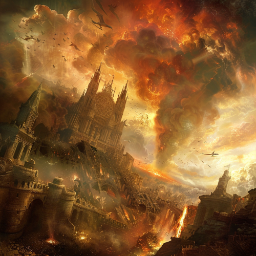 fantasy art, Now, as the winds of time sweep across the scarred landscape, the ruins stand as a silent testament to the hubris of those who dared to wield such terrible power. The memory of the city consumed by fire serves as a cautionary tale
